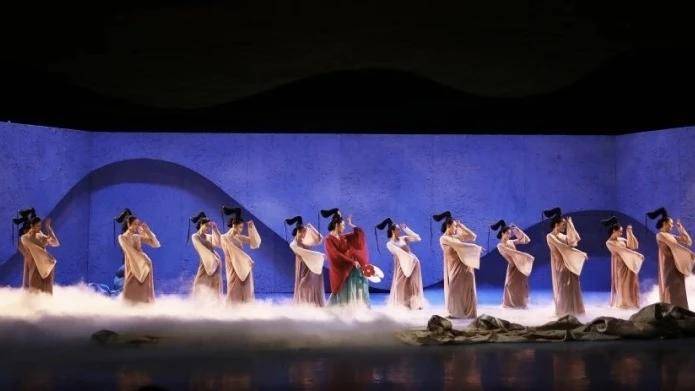 ??《月洛惊鸿》由辽宁歌舞团(辽宁民族乐团)创排,灵感源自辽宁省博物馆镇馆之宝——宋人摹顾恺之《洛神赋图》,是辽歌与辽博跨界合作、文物活化的创新典范。作品以“初见、情愫、别离、归神”四章展开,在6分钟的凝练表达中,21位舞者身着复原魏晋服饰,以行云流水的群舞与独舞,再现洛神与曹植的千年绝恋,实现了传统文化与当代艺术的完美契合。